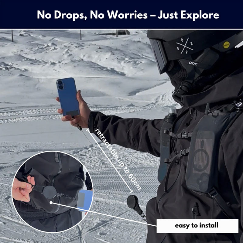 Designed for the slopes. As seen in the images, this tether secures your phone to your jacket or backpack strap. It is the ultimate insurance policy against dropping your device into deep powder or onto rocky terrain below. Ride hard and take selfies without the fear of losing your connection to the world.
